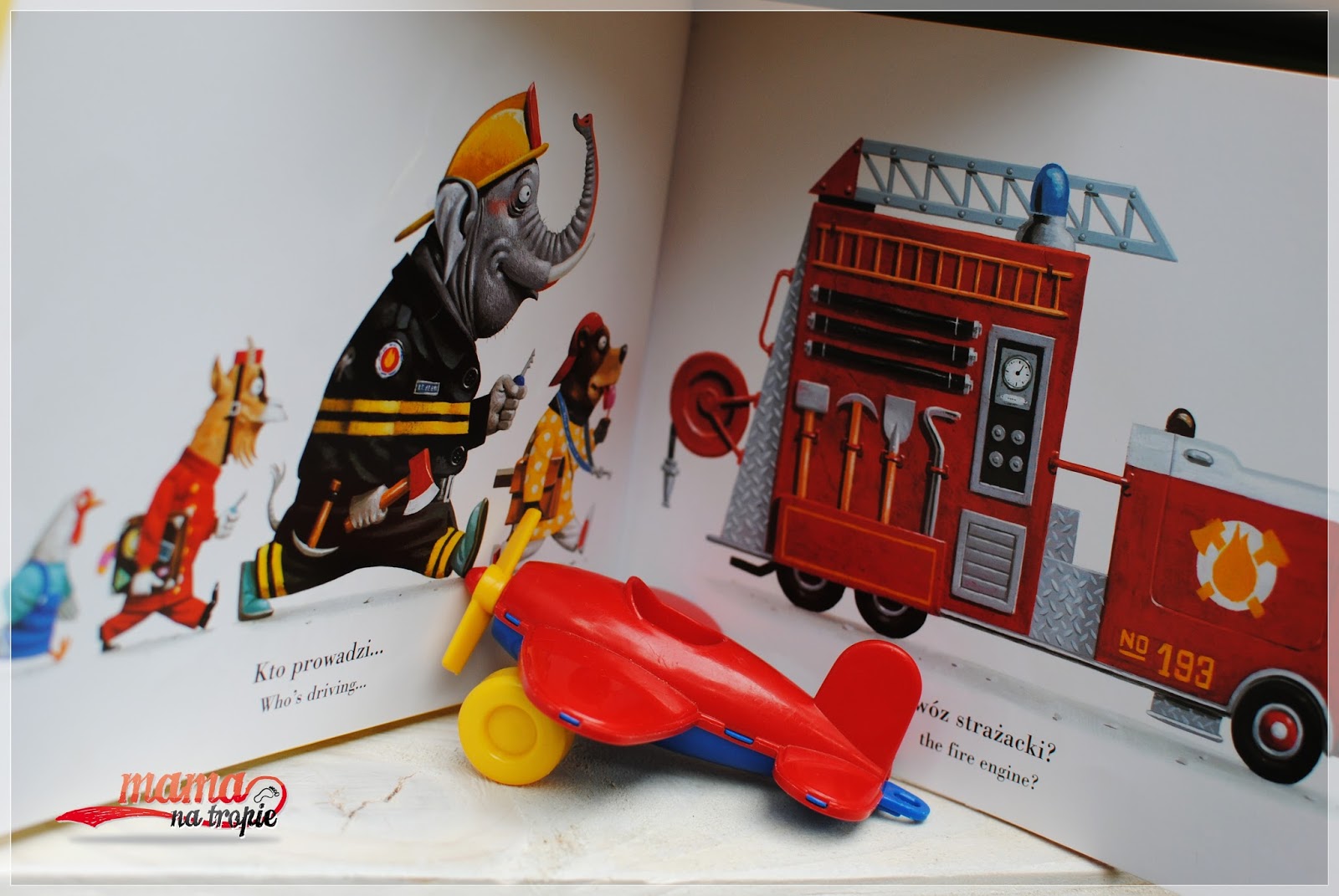 Autorem „Kto prowadzi” jest Leo Timmers, tak jak kilka innych pozycje tego wydawnictwa jest to książka dwujęzyczna. Treść jest zarówno w języku polskim jak i angielskim, co pozwala nam popracować z dzieckiem. Ma twardą okładkę, dla nas to bardzo istotne ponieważ im mniejsze dziecko tym bardziej prawdopodobne jest poniesienie uszczerbku przez książkę. Co mnie zdziwiło jest ona szyta! To już niestety niezbyt częste. Na każdej stronicy znajdziemy kolorowe, dobrze przemyślane ilustracje dokładnie odwzorowujące treść. Książka jest bardzo ciekawa nawet dla 2-lataka, w tym wieku Jasio otrzymał tą pozycję ode mnie w prezencie. Książka wciąga, zbudowana jest na zasadzie interakcji dziecko – dorosły. Z racji znajdujących się w niej pytań szybko wciąga każdego i angażuje jego uwagę, wyobraźnię i wiedzę. A takie książki bardzo lubię. Choć wymagają obecności dorosłego na 100% przy lekturze. Koszt tej książki to 29,90zł choć można znaleźć ją w promocji!