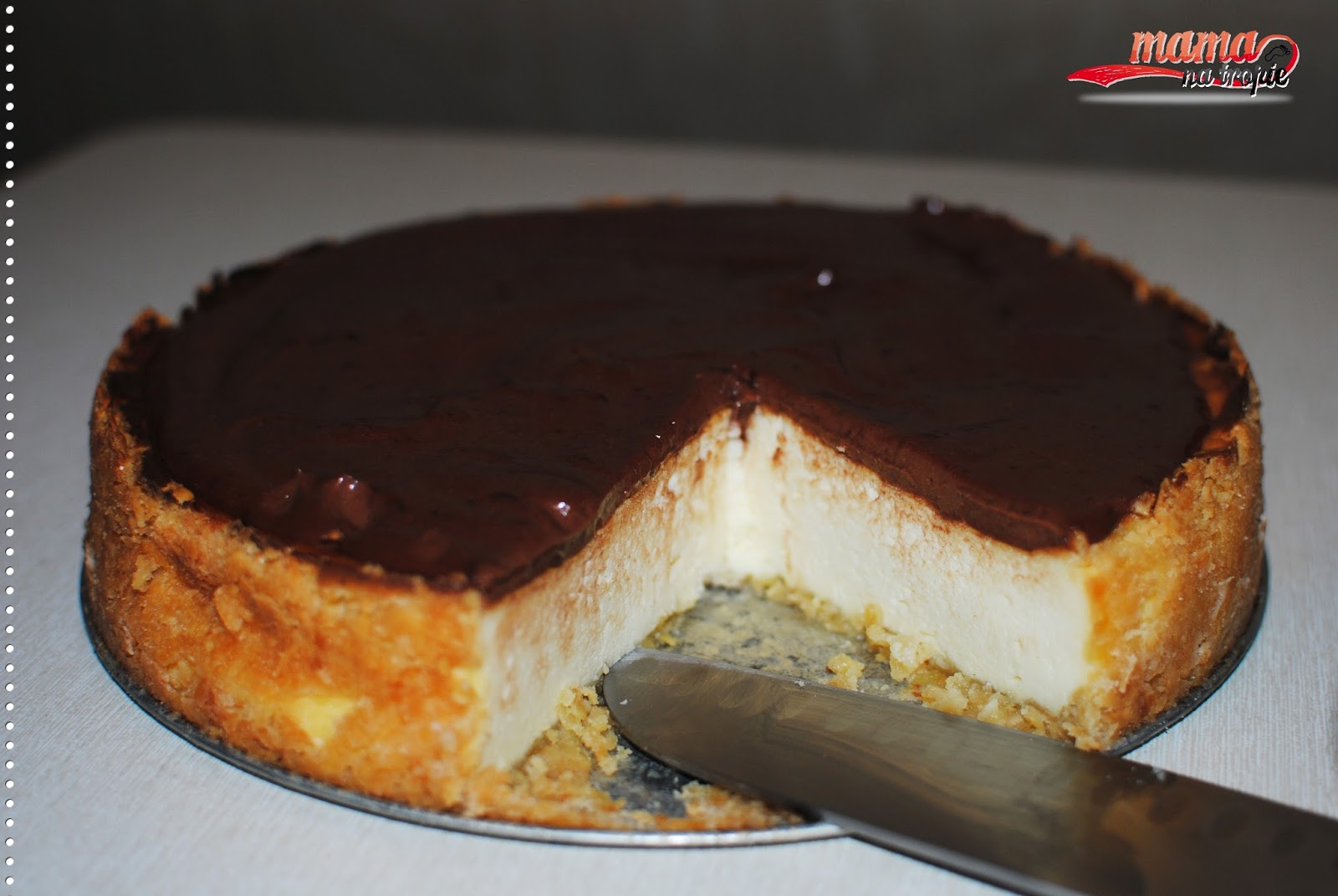 Piecz w nagrzanym piekarniku do 180 stopni C przez 60 minut. Pozostaw do wystudzenia. Przygotuj polewę. W rondelku podgrzej sok z cytryny, zdejmij z ognia i włóż czekoladę i mieszaj, aż czekolada się rozpuści. Dodaj cukier puder i śmietanę, wszystko wymieszaj. Upieczony sernik polej polewą i odstaw do schłodzenia. Smacznego łasuchowania życzę 🙂