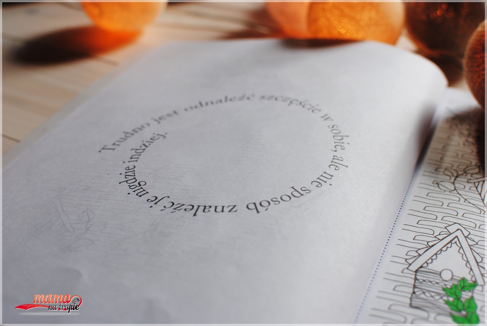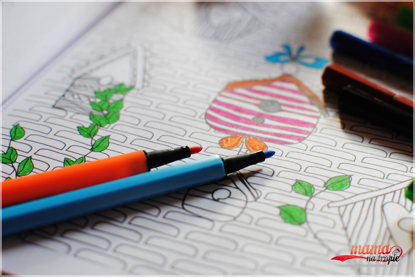 Jest to kolorowanka dla dorosłych zamknięta w miękką okładkę o formacie A4. Już okładka wprowadza nas do świata plastyki, rysunku i koloru. W środku znajdziemy na kolejnych stronicach czarno-białe plansze do samodzielnych zajęć plastycznych. Naprzeciw każdej strony z rysunkiem znajdziemy stronę z ciekawym cytatem lub/i mottem, które może stać się przewodnikiem danego dnia. Ja żeby móc oddać się relaksowi przy kolorowance zakupiłam sobie opakowanie pisaków w neonowym różu. Za każdym razem przez nie narażam się na zbędną uwagę moich dzieci, które na siłę chcą również przetestować moje pisaki. I jak, polubiłam się z tą formą relaksu?