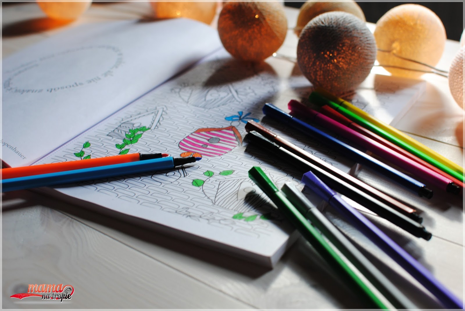 Siadam do Łowców Chmur wieczorami, kiedy wszyscy już śpią, blisko zapalonych w kącie lampek cotton balls. I pomału, po cichu, zdecydowanie otoczona tylko tym co robię maluję na kolejnych kartach pisakami. Tak, polubiłam się z tą aktywnością. Czy pokochałam? Chyba jeszcze nie, zbyt ze mnie nerwowy człowiek, zbyt szybki. A do kolorowanki dla dorosłych trzeba dłuższej chwili, skupienia się na wykonywanej czynności i serca. Ale dzięki niej ćwiczę się w cierpliwości oraz uspokajam wieczorami przed snem. I tak co jakiś czas staczam z samą sobą walkę, aby opróżnić po całym dniu głowę z zamieszania i spokojnie położyć się spać. Polecam Wam gorąco zmierzenie się z tą formą relaksu, postawienie przed sobą tego specyficznego wyzwania!