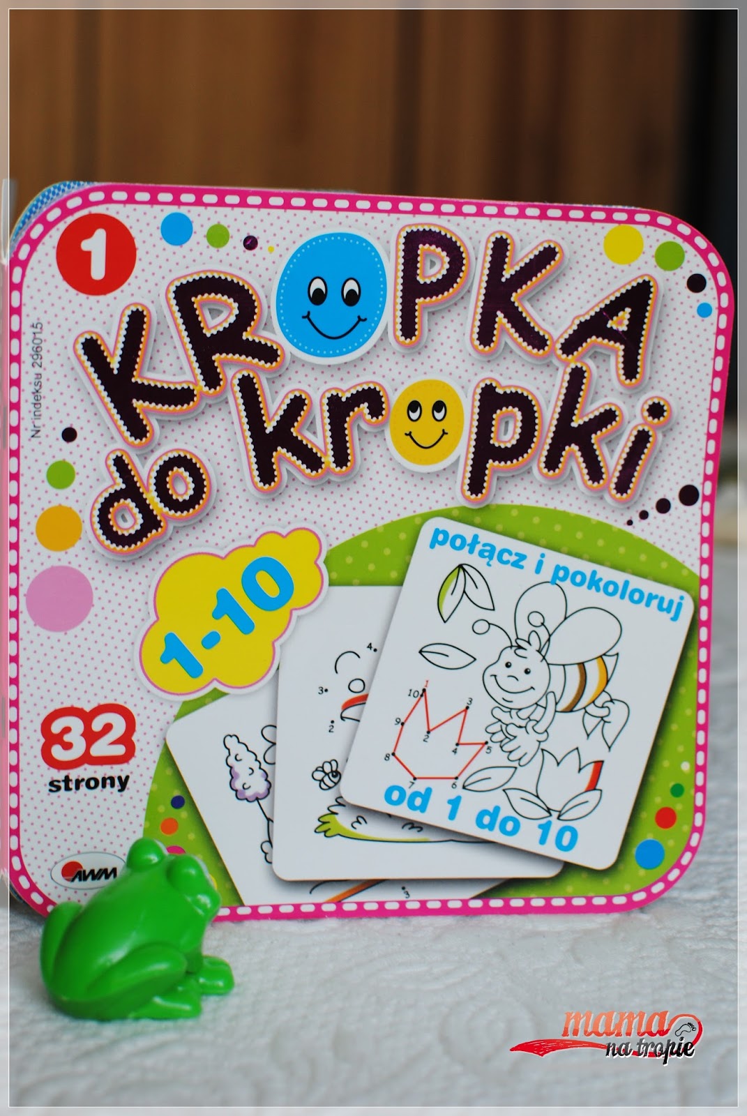 Ostatnią książką był egzemplarz z serii Kropka do kropki 1-10. Seria ma kilka stopni trudności, które możemy dobrać sugerując się umiejętnościami dziecka. Jest to książeczka w lekko utwardzanej okładce z ciekawymi ilustracjami w środku. Nasz egzemplarz zawierał elementy, które syn musi połączyć liniami zaczynając od 1 a kończąc na 10. Dzięki temu, z pomocą rodzica dziecko uczy się liczyć oraz rozpoznawać liczby. Ćwiczy również prawidłowe ułożenie kredki czy ołówka w dłoni oraz prowadzenia linii. Oczywiście w nagrodę może pokolorować powstały po połączeniu kropek obrazek. Bardzo fajna forma pozwalająca wprowadzać nam dziecko w świat szlaczków i linii.Wszystkie te wydawnictwa możemy zakupić na stronie Wydawnictwa AWM <<TUTAJ>> w cenie: Poznaję… Dinozaury 11,90zł; Kropka do kropki 6,99zł oraz Kolorowanki naklejanki – wesołe dinozaury 6,99zł lub w dobrych księgarniach.